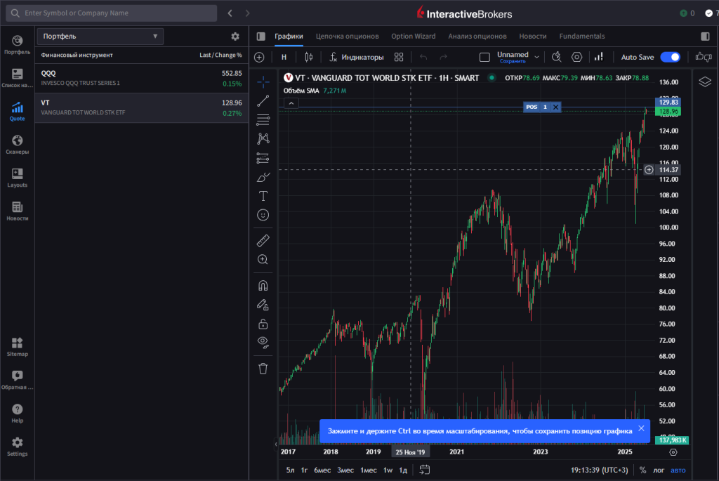 Мені допоміг знайомий Фінансовий консультант: за годину ми відкрили акаунт, пройшли верифікацію, поповнили рахунок і купили мій перший ETF — Vanguard Total World Stock ETF (VT).